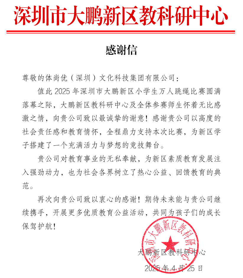 此次比赛圆满落幕,不仅是对参赛选手奋力拼搏的肯定,更是对深圳市大鹏新区体育教育事业的有力推动。大赛结束后,体尚优(深圳)文化科技集团有限公司收到来自深圳市大鹏新区教科研中心的感谢信,信中对体优科技全力支持本次比赛表示诚挚谢意。对此,体优科技表示未来将持续为社会各界注入更多的强劲动力,为青少年的健康成长提供坚实有力的支持!